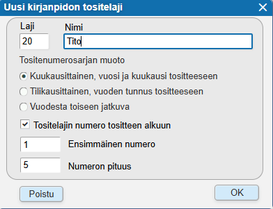 Tositelajit määritellään sovellusikkunan Taloushallinto-välilehdeltä avautuvassa Kirjanpito-sovelluksessa. Tositelajeihin päästään ylävalikosta (Kirjanpito > Tositelajien määritys).