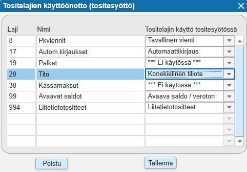 Kirjanpidon ylävalikosta Kirjanpito > Tositelajien käyttöönotto valitaan tositelajeille Tito ja Avaavat saldot alla olevan kuvan mukaiset käyttötavat. Muut edellä luodut tositelajit jätetään ***Ei käytössä*** -tilaan, jotta ne voidaan valita muissa sovelluksissa käyttöön (Ostoreskontra, Weblaskutus).