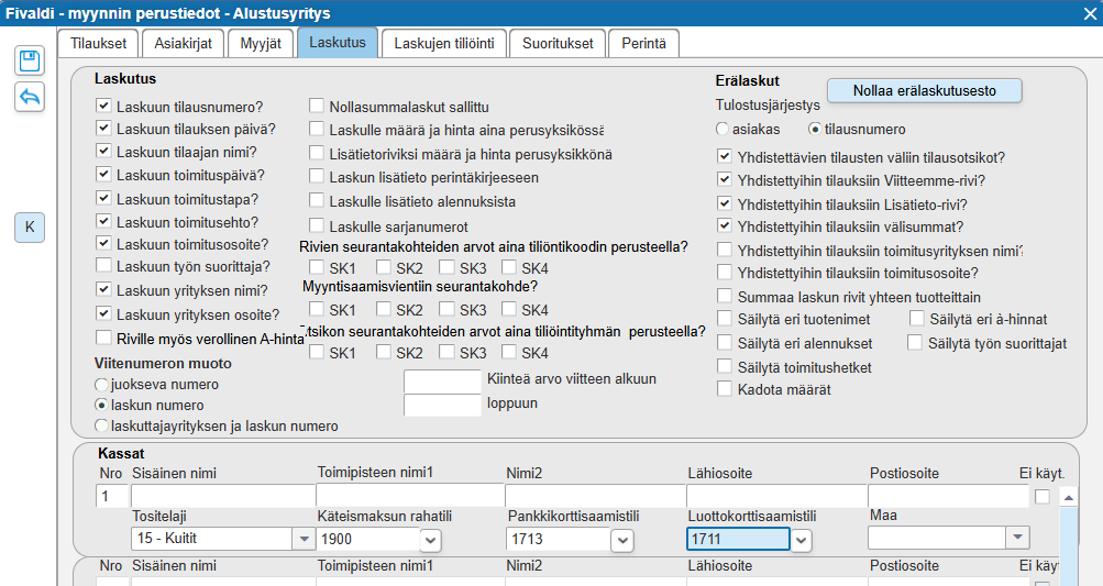 Sovellusikkunan Myynti-välilehdeltä avautuvan Tilaustenkäsittelyn ylävalikosta (Tilaukset > Perustiedot) päästään myynnin perustietoihin. Laskutus-välilehdellä määritellään laskutukseen liittyvät asetukset alla olevan kuvan mukaisesti ja otetaan Kuitit-tositelaji käyttöön: