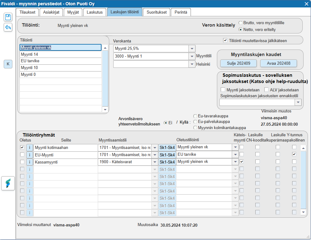 Tuoterekisteriin perustetaan muutama mallituote, joille tallennetaan tiliöintiryhmäkohtaiset tiliöinnit: