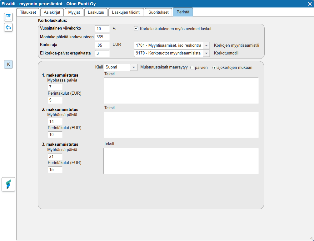 Löydät lisää näihin aiheisiin liittyviä ohjeistuksia seuraavista ohjeista: Tilaustenkäsittely, Myynnin perustiedot ja Myyntireskontra - korkolaskutus.