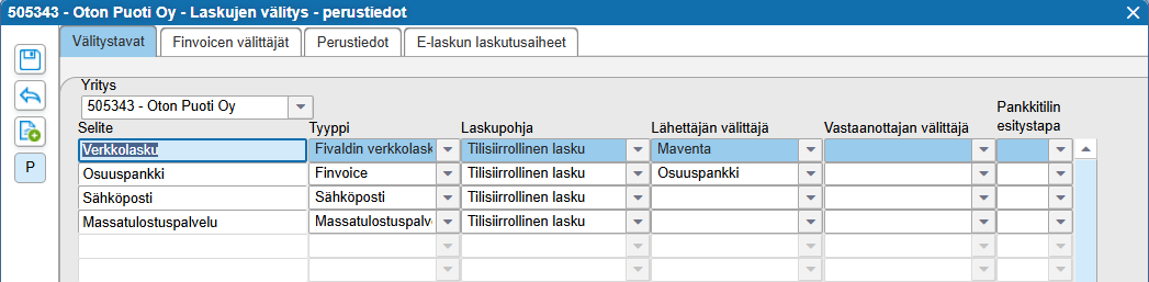 Määrittele laskujen välitykseen liittyvät asetuksen Laskujen välityksen perustiedoissa (sovellusikkuna > Myynti > Laskujen välitys > ylävalikon Laskujen välitys > Perustiedot). Laskujen välityksen perustietoihin perustetaan tarvittavat välitystavat alla olevan kuvan mukaisesti.