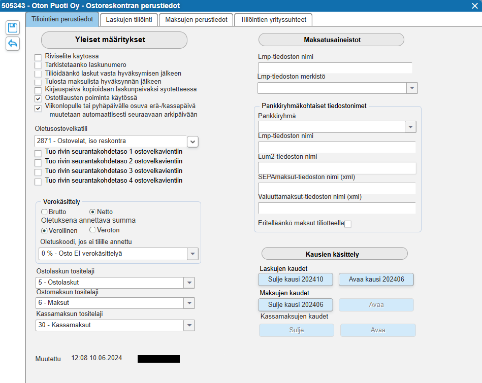 Perusta ostojen määritykset Ostoreskontran perustiedoissa (sovellusikkuna > Ostot > Ostoreskontra > ylävalikon Ostoreskontra > Perustiedot > Tiliöintien perustiedot -välilehti). Perusta oletusostovelkatili, valitse verokäsittely ja tallenna oletuskoodi (esim. Osto EI verokäsittelyä). Ostolaskut ja Maksut -tositelajit ovat jo valmiina oletuksena, mutta Kirjanpidossa perustettu Kassamaksut-tositelaji valitaan kohtaan Kassamaksun tositelaji.