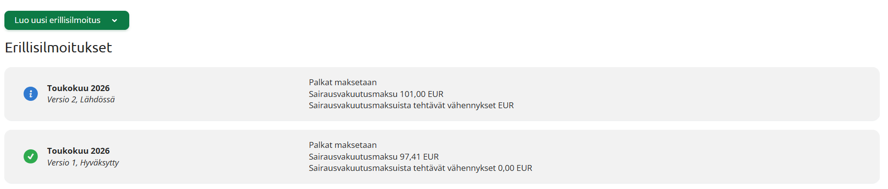 - Äsken lähettämäsi korvaava ilmoitus (Versio 2) näkyy Erillisilmoitus-välilehdellä omana rivinään.
