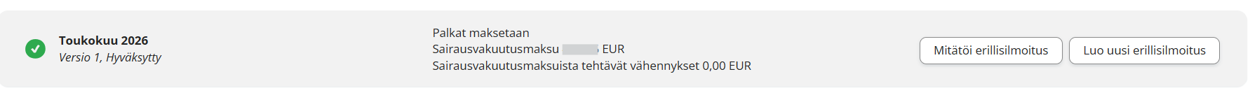 Tarkista, että Tulorekisteri hyväksyy lähetetyn erillisilmoituksen. Onnistuneen käsittelyn jälkeen ilmoitus näkyy Erillisilmoitus-välilehdellä hyväksyttynä. Jos Tulorekisteri hylkää erillisilmoituksen, katso ohje: Hylätyn erillisilmoituksen uudelleen lähetys.