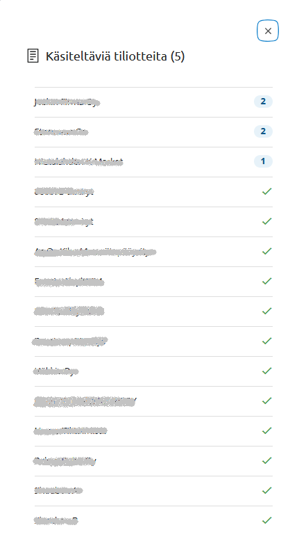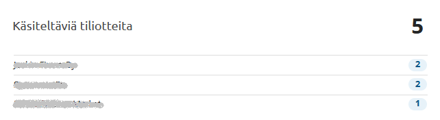Napsauttamalla Käsiteltäviä tiliotteita -otsikkoa, näet kaikki suosikkiyrityksesi ja niiden käsiteltävien tiliotteiden määrän. Jos yrityksen nimen perässä on oikein-merkki, yrityksellä ei ole käsittelemättömiä tiliotteita. Jos yritys näkyy harmaana, sinulla ei ole yritykseen tiliotteiden käsittelyoikeuksia.