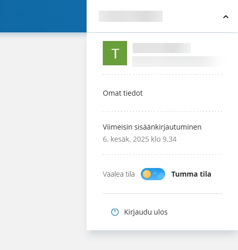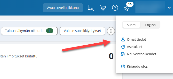 Valitaan ruudun oikeasta yläkulmasta oman nimen kohdalta Omat tiedot