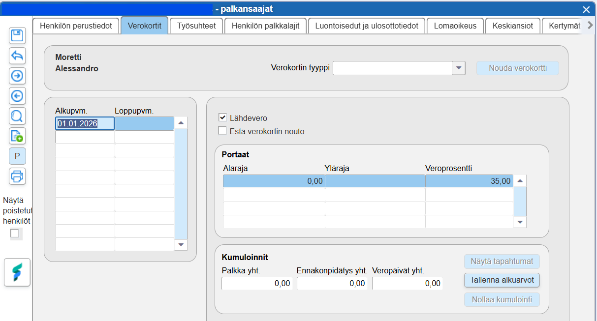 - Palkansaajan Verokortit-välilehdellä valitaan Verokortin tyyppi kohtaan joku muu kuin Palkkatulon verokortti tai jätetään se tyhjäksi. Ruksataan Lähdevero-valintaruutu ja syötetään veroprosentti portaikkoon. Alarajaksi annetaan 0, ylärajaa ei anneta.