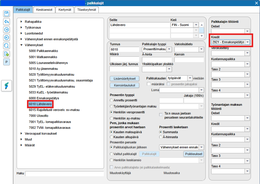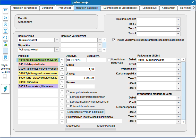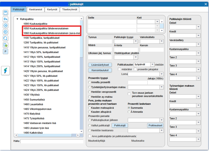 HUOMIOI: Verovelvolliselle palkansaajalle joka ei ole lähdeveron alainen perustetaan vastaavat omat palkkalajit soveltuvasti nimettyinä (esimerkiksi ”Kuukausipalkka rajoitetusti verovelvollinen”).