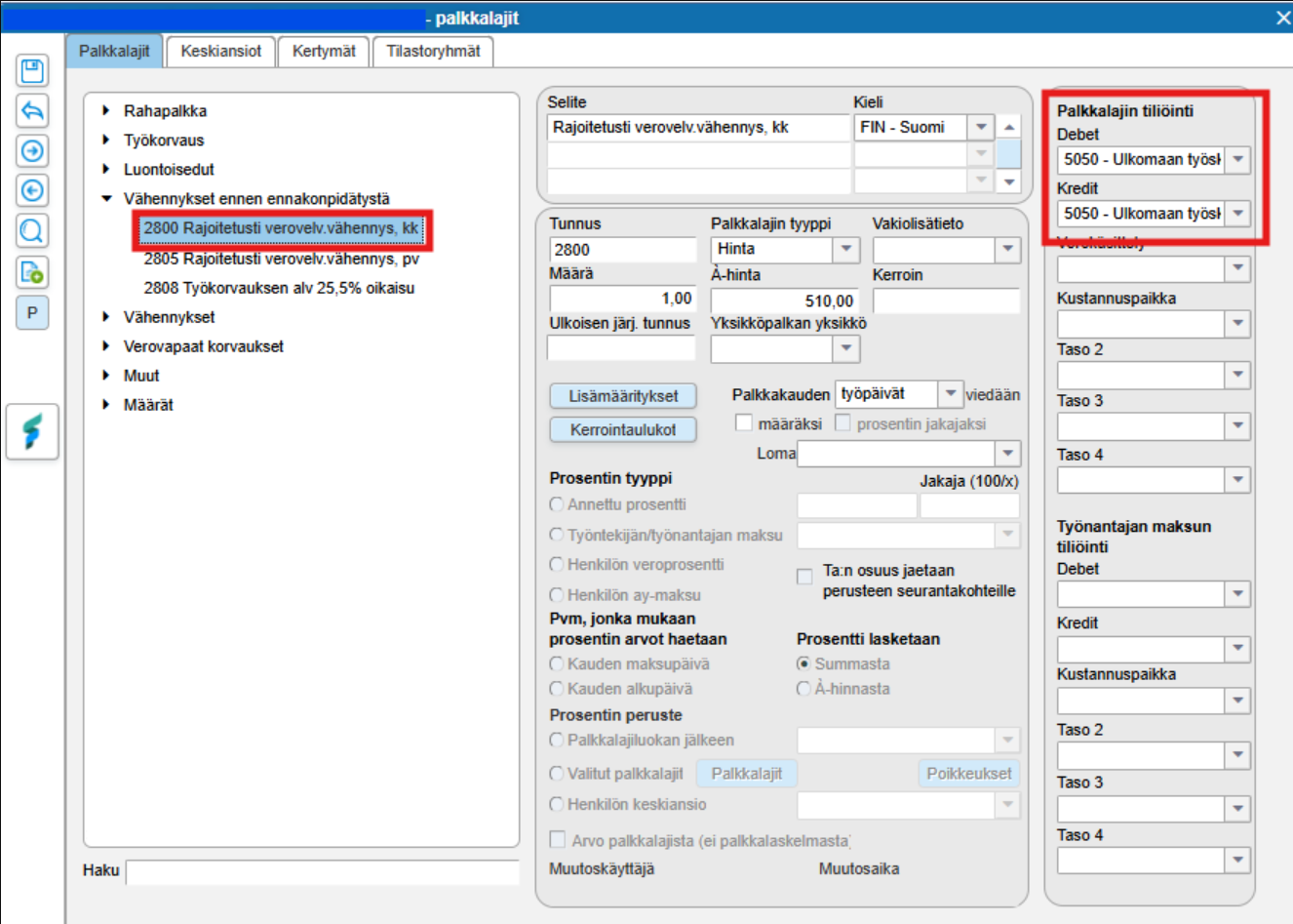 - Palkkalajiluokassa Vähennykset ennen ennakonpidätystä lähdeveroon liittyvät palkkalajit on oltava tiliöity (Debet ja Kredit). Tämän esimerkin kuvissa 2800 on kuukausikohtainen vähennys, 2805 on päiväkohtainen vähennys. Muista linkittää nämä palkkalajit tulorekisterin tulolajiin ”405 Lähdeverovähennys”. (Esimerkin palkkalaji 2808 ”Työkorvauksen alv 25,5% oikaisu” linkitetään tulolajiin ”Työkorvaus”.)