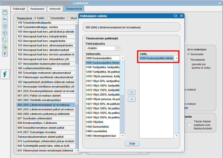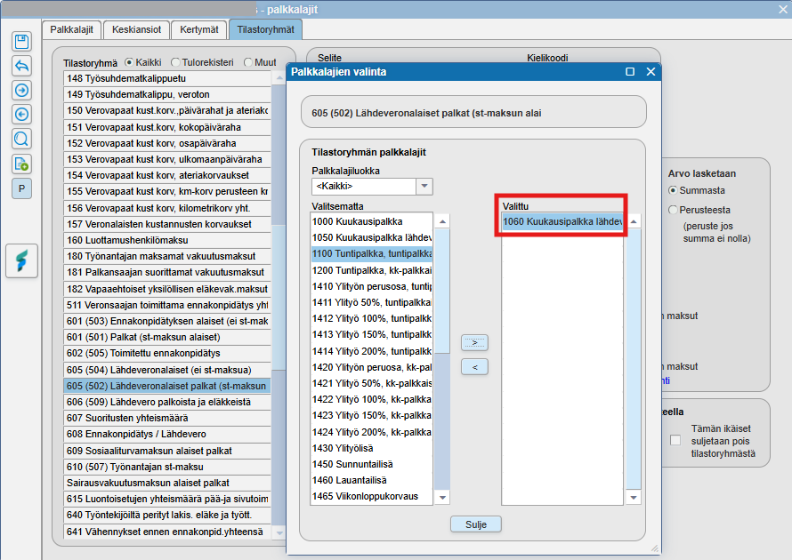 - Ryhmässä ”605 (502) Lähdeveronalaiset palkat (st-maksun alaiset)” valitaan palkkalaji; tässä esimerkissä ”1060 Kuukausipalkka lähdeveronalainen (st-maksu) / arvo lasketaan summasta”.