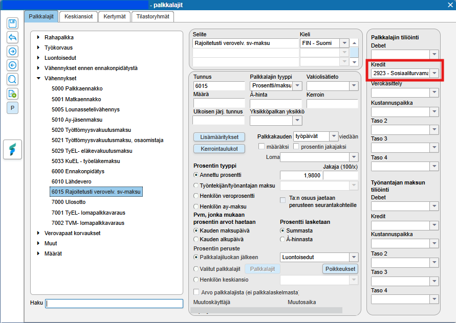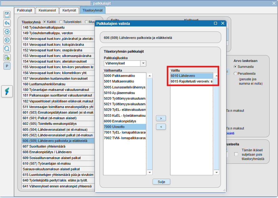 - Ryhmässä ”606 (509) Lähdevero palkoista ja eläkkeistä” valitaan palkkalaji, tässä esimerkissä ”6010 Lähdevero” sekä ”6015 rajoitetusti verovel. sv-maksu / arvo lasketaan summasta”.