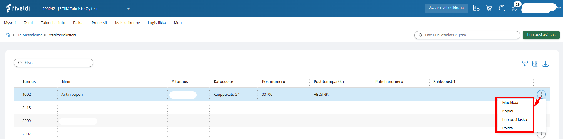 Voit muokata, kopioida tai poistaa asiakkaan napsauttamalla rivin lopussa olevaa kolmen pisteen painiketta: