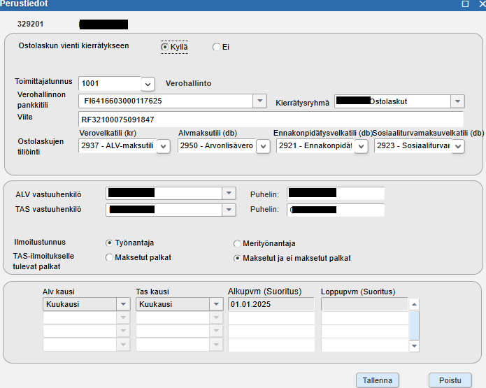 Muuta huomioitavaa: Jos henkilö on Alv- tai Tas-ilmoitusvelvollinen ja oma-aloitteisten verojen ilmoitukselle halutaan molemmat oma-aloitteiset verot, lisää kausivalinta ja alkupäivä, josta velvollisuus alkoi. Lisää myös päätöspäivä aiemmille kausille, jos niitä on. Tarkista tietojen oikeellisuus; jos Alv- ja/tai Tas-kausi ei ole voimassa, ei oma-aloitteisten verojen ilmoitukselle tuoda Alv- ja/tai Tas-tietoja. Tas-tiedot nousevat Työnantajasuoritukset-raportille ilman Tas-kauden valintaakin.