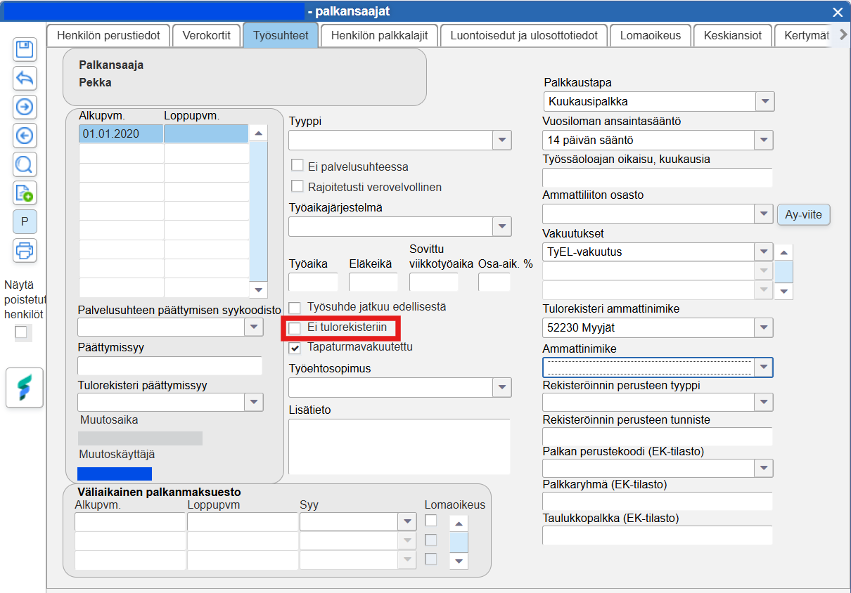 Jos haluat tehdä palkkatietoilmoituksen asiointipalvelun kautta, valitse palkansaajan tiedoissa valintaruutu Ei tulorekisteriin. Kun palkkatietoilmoitus on manuaalisesti hyväksytty, voit tyhjentää valintaruudun, jos haluat jatkossa ilmoittaa kyseisen palkansaajan tiedot suoraan Fivaldin palkanlaskennasta tulorekisteriin.