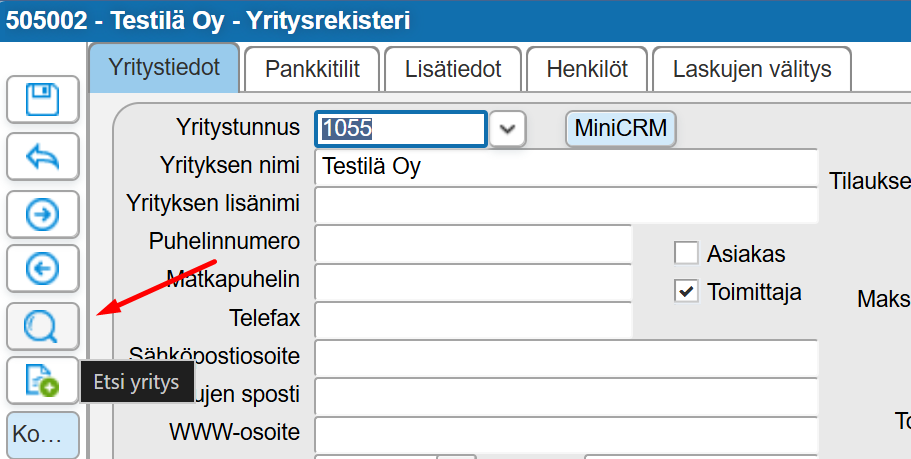 = voit määritellä haussa kriteeriksi vain Asiakkaat, vain Toimittajat, vain Asiakkaat/Toimittajat, vain ne yritykset jotka eivät ole kumpiakaan taikka hakea yrityksiä kriteerillä ”Näytä kaikki” (oletus).