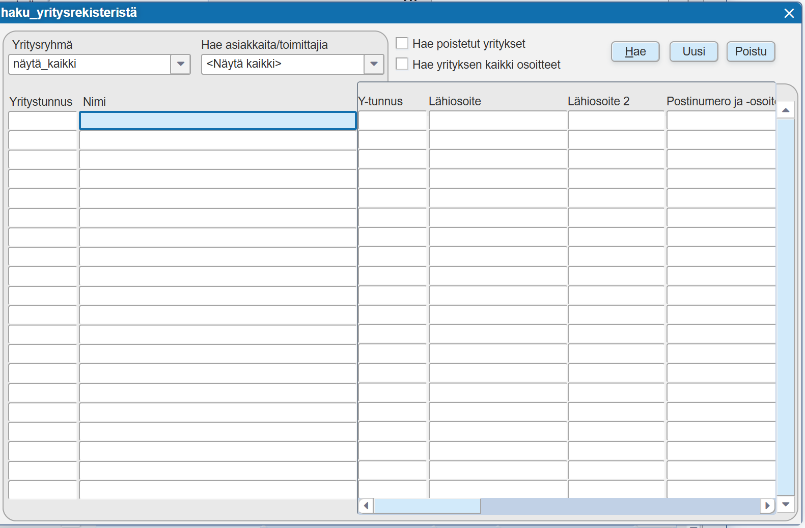 a.) mikäli kohtaa ei haussa ruksata. Hakuruudulle etsitään vain ei poistettuja yrityksiä.