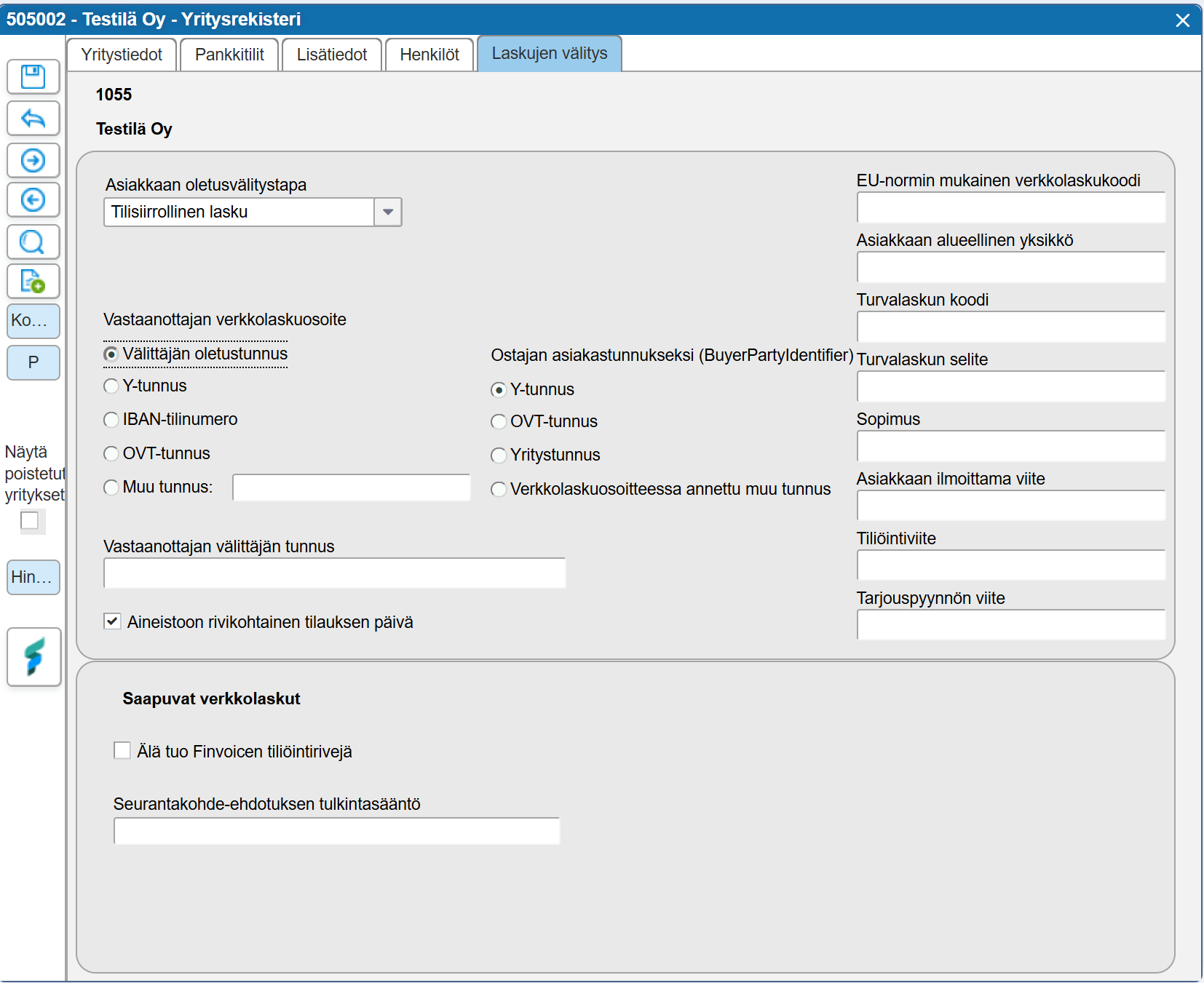 Ostajan asiakastunnukseksi (BuyerPartyIdentifier) = Valinta vaikuttaa siihen, mikä tieto tulee Fivaldista lähtevään BuyerPartyIdentifier-elementtiin. Oletuksena Fivaldi asettaa elementtiin Y-tunnuksen.
