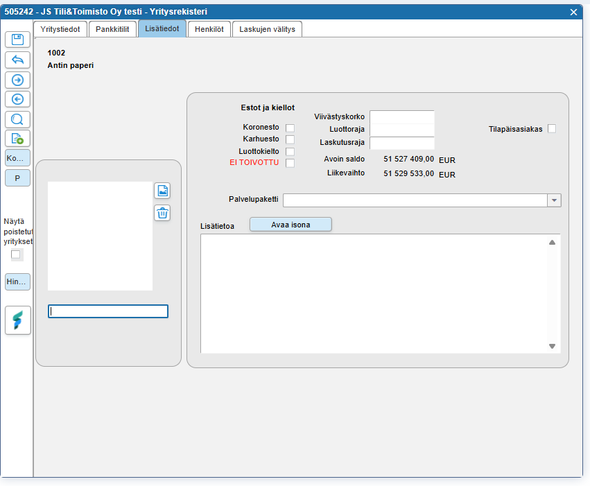 Yritysrekisterin Lisätiedot-välilehdellä voit lisätä/poistaa asiakkaan tai toimittajan kuvan tai sisäistä lisätietoa, asettaa asiakaskohtaisia estoja, rajoja tai viivästyskoron. Näet myös asiakkaan avoimen saldon sekä laskutuksen.