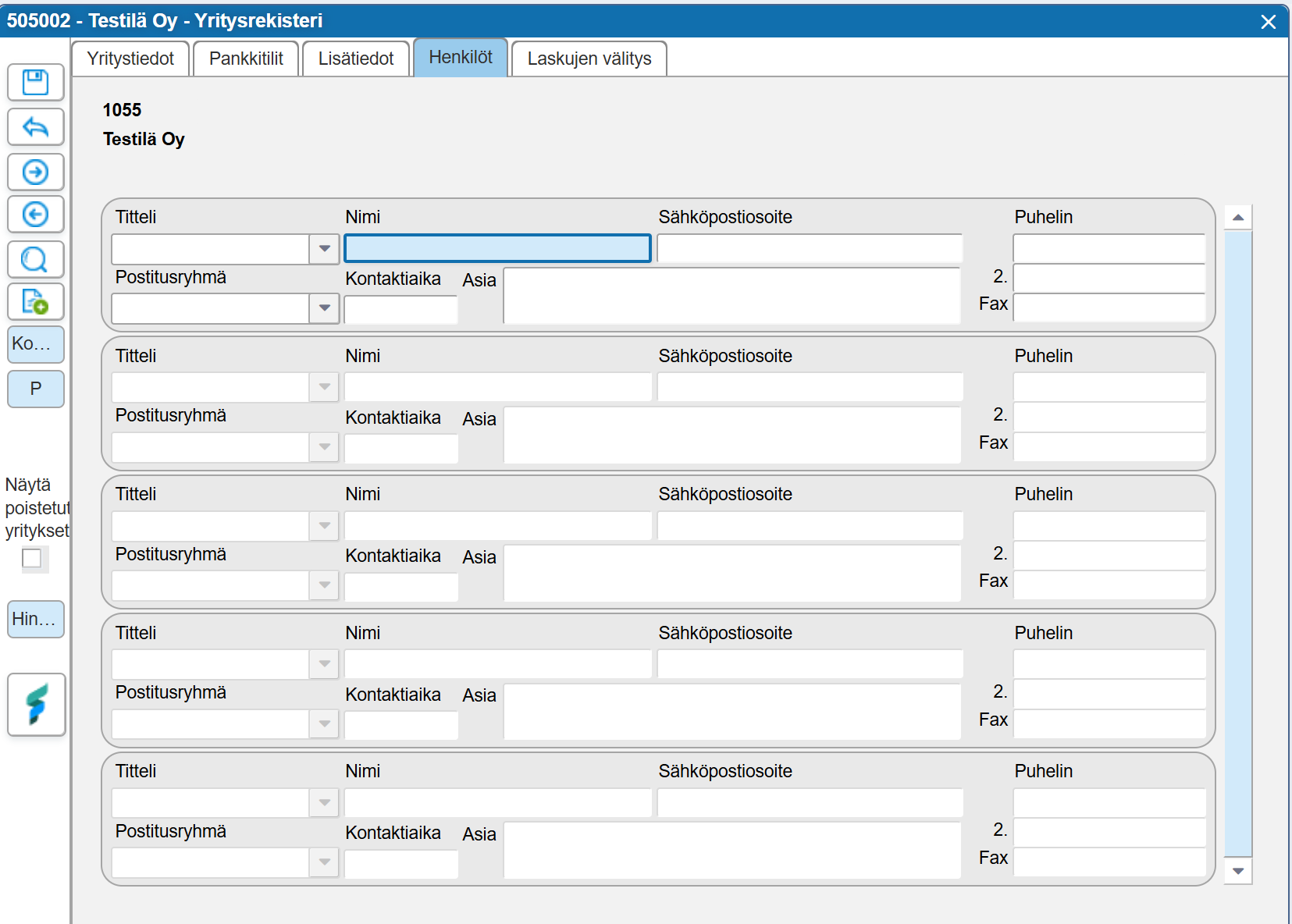 Yritysrekisterin Henkilöt-välilehdellä voit tallentaa asiakkaan/toimittajan tietoihin henkilöitä. Yritykselle voidaan tallentaa rajattomasti henkilötietoja. Saat tarvittaessa uuden vapaan rivin painamalla viimeisessä kentässä näppäimistön nuoli alas -painiketta. Henkilöiden tiedot tulostuvat mm. Yritysluettelo-raportille. Postitukset voidaan tarvittaessa lähettää kaikille henkilöille tai rajatuille henkilöille.