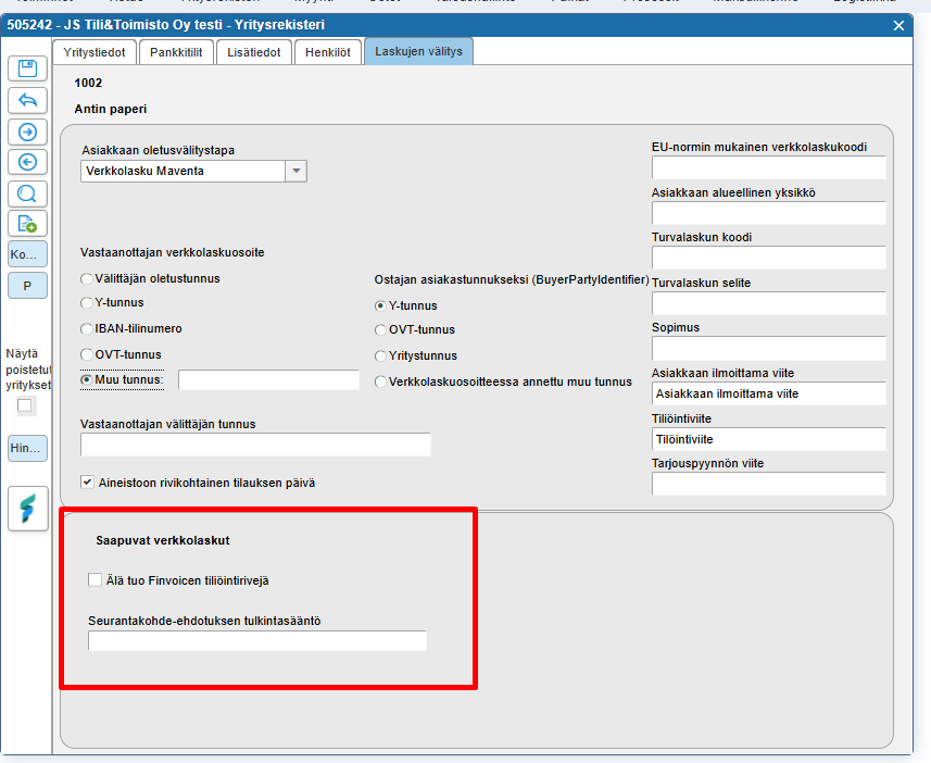 - Finvoice-tunnus = Valitse, jos kyseessä olevan pankkitilin IBAN-tilinumero toimii asiakkaan verkkolaskuosoitteena. Asiakkaan verkkolaskuosoite voidaan tallentaa myös Muu-tunnus -kenttään Laskujen välitys -välilehdellä.