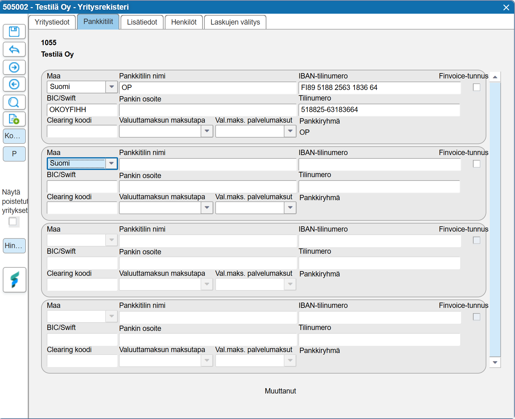 Yritysrekisterin Pankkitilit-välilehdellä voit tallentaa ja ylläpitää asiakkaan/toimittajan pankkitilejä: