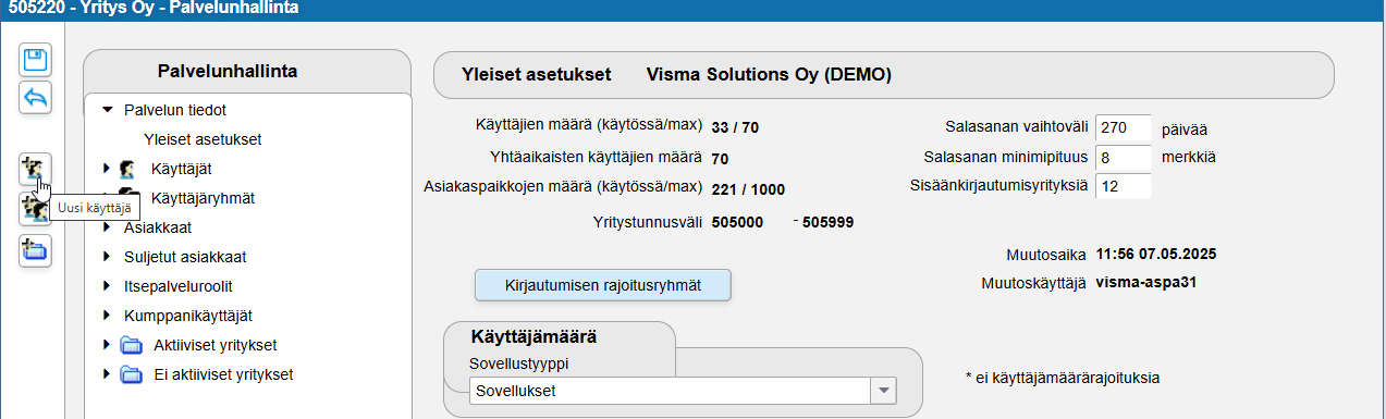 - Jos Uusi käyttäjä -painike näkyy harmaana, vapaita käyttäjäpaikkoja ei ole. Voit poistaa tarpeettomia käyttäjiä, jolloin käyttäjäpaikkoja vapautuu, tai voit olla yhteydessä Fivaldin sovellustukeen tai myyntiin käyttäjäpaikkojen lisäämiseksi.