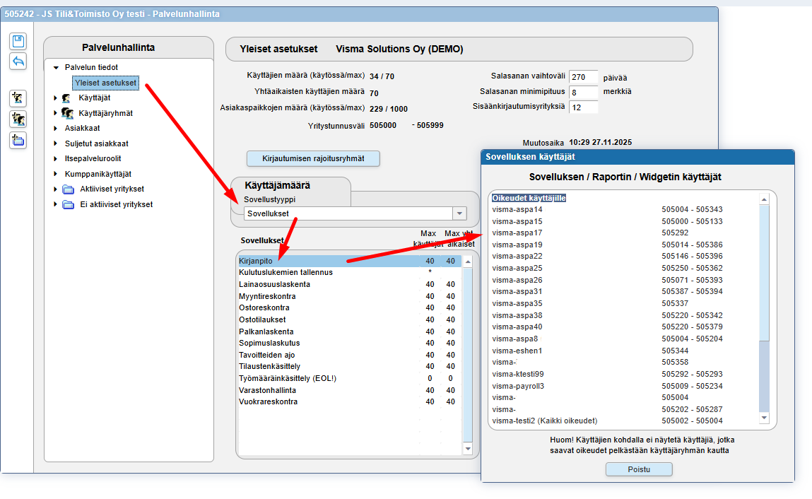 Jos ohjelma ilmoittaa Käyttäjän lisäys ryhmään epäonnistui, käyttäjien määrä ylittyi x sovellusten osalta, katso ensin ilmoituksesta minkä sovellusten tai raporttien osalta käyttäjämäärät ylittyivät (esim. Kirjanpito). Tämän jälkeen siirry Palvelunhallinnan Yleiset asetukset -sivulle ja tuplaklikkaa kyseistä sovellusta/raporttia: ohjelma avaa ikkunan, josta voit tarkistaa annetut käyttöoikeudet sovelluskohtaisesti. Rivin lopussa näkyy yrityspaikan numero (tai yritysväli, jos käyttäjällä/ryhmällä on kyseinen oikeus useamman yrityksen osalta).