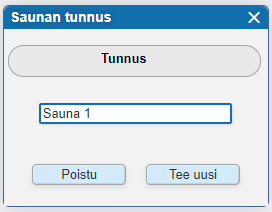 Ohjelma avaa Saunan tunnus -ikkunan. Anna saunalle tunnus (esim. Sauna 1). Jos et luo enempää saunoja, napsauta Poistu-painiketta. Jos luot lisää saunoja, napsauta Tee uusi -painiketta.