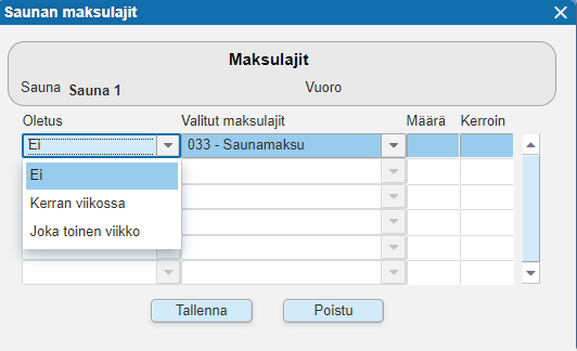 Ohjelma avaa Saunan maksulajit -ikkunan. Määrittele Oletus-kenttään miten maksulajia käytetään (esim. kerran viikossa. Valitse Valitut maksulajit -sarakkeessa pudotusvalikosta saunamaksun maksulaji. Tämän jälkeen napsauta Tallenna ja Poistu.