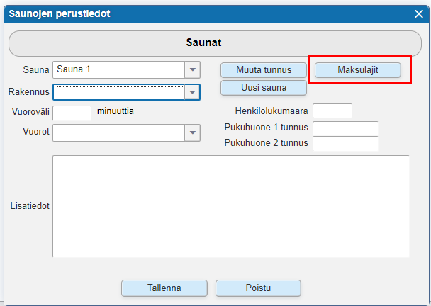 Napsauta Maksulajit-painiketta ja valitse seuraavaksi maksulaji saunavuoroille.