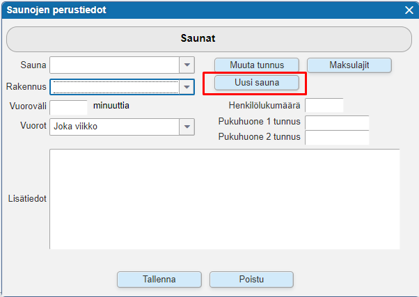 Valitse ylävalikosta Saunavuorot > Perustiedot ja napsauta Uusi sauna -painiketta.