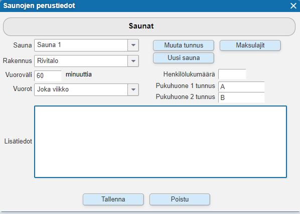 - Vuorot: valitse, miten yhtiössä on mahdollisuus varata saunavuoro (joka viikko/joka toinen viikko).