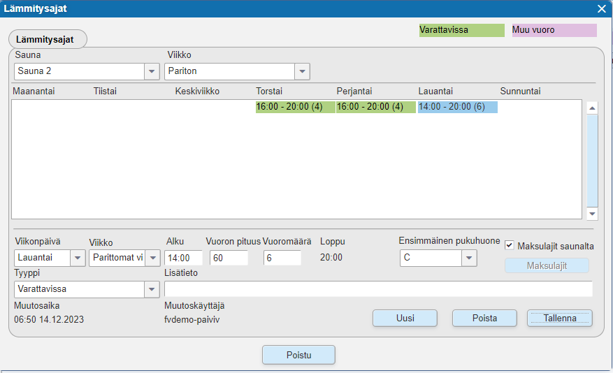- Viikko: valitse parillinen tai pariton (molemmat perustettava erikseen). Kenttä näkyy vain, jos saunan vuorotyypiksi on perustiedoissa valittuna "Joka toinen viikko".