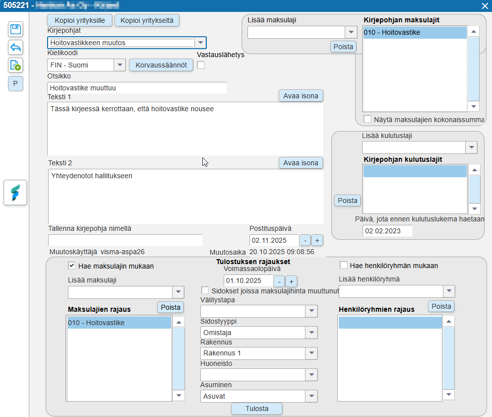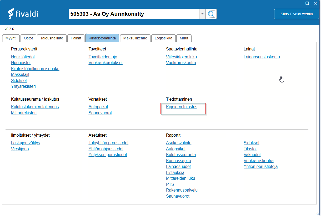 Voit tulostaa ja lähettää asiakastiedotteita Kirjeiden tulostamisen avulla. Kirjeiden tulostaminen löytyy Sovellusikkunasta Kiinteistöhallinnan alta.