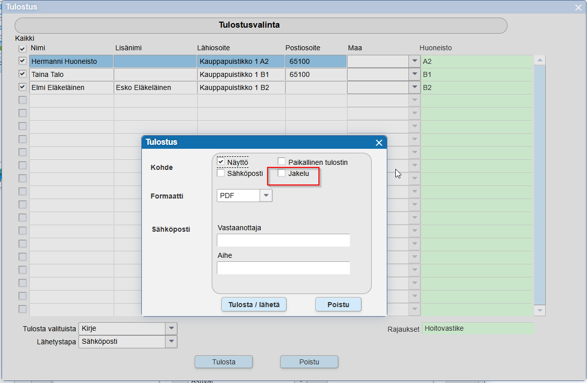 Tulosten painikkeen jälkeen lähetys käynnistyyu ja Jakelu-täpällä voidaan lähettää myös sähköiset kirjeet