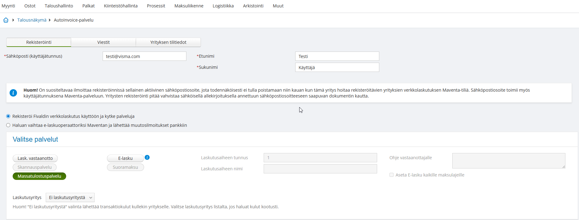 HYVÄ TIETÄÄ:   Massatulostuspalvelua ei ole mahdollista ottaa käyttöön ilman Verkkolaskupalveluun rekisteröitymistä. Jos rekisteröintiä ei ole tehty, sen voi tehdä tällä samalla sivulla samanaikaisesti Massatulostuspalvelun kytkennän kanssa.