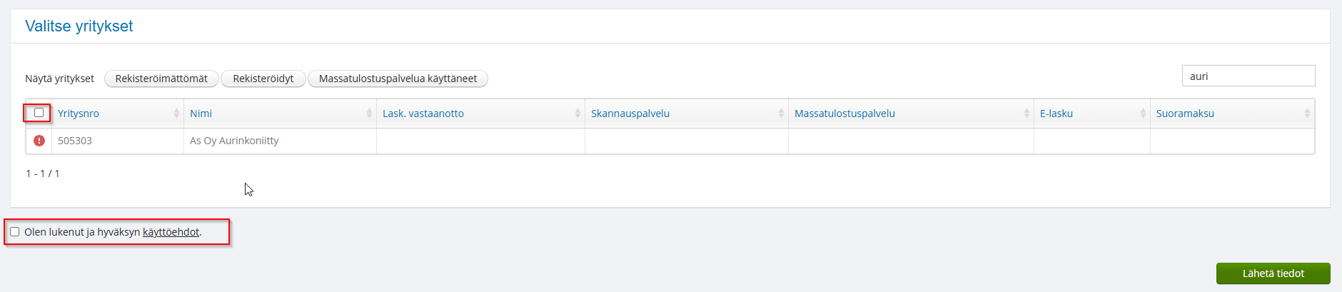 2. Valitse “Valitse yritykset” -osiosta ne yritykset, joille haluat kytkeä  Massatulostuspalvelun  päälle. (Voit tarkistaa yritystaulukon Massatulostuspalvelu -sarakkeesta, millä yrityksillä Massatulostuspalveluun on jo päällä.)