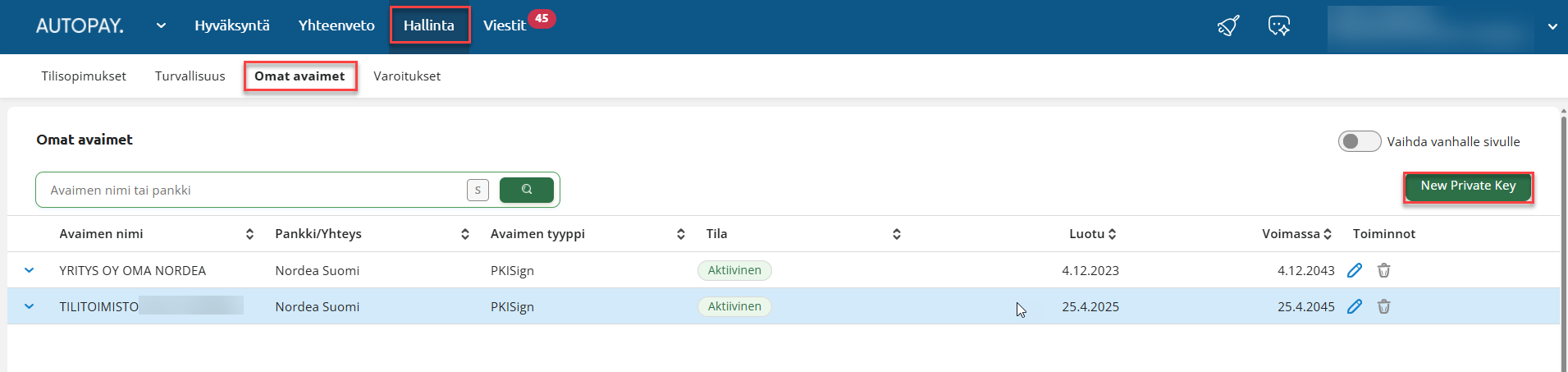 Autopayssa olevien avainten (=pankkivarmenteiden) tietoja voi muokata Autopayn käyttöliittymässä Hallinta > Omat avaimet -välilehdellä.
