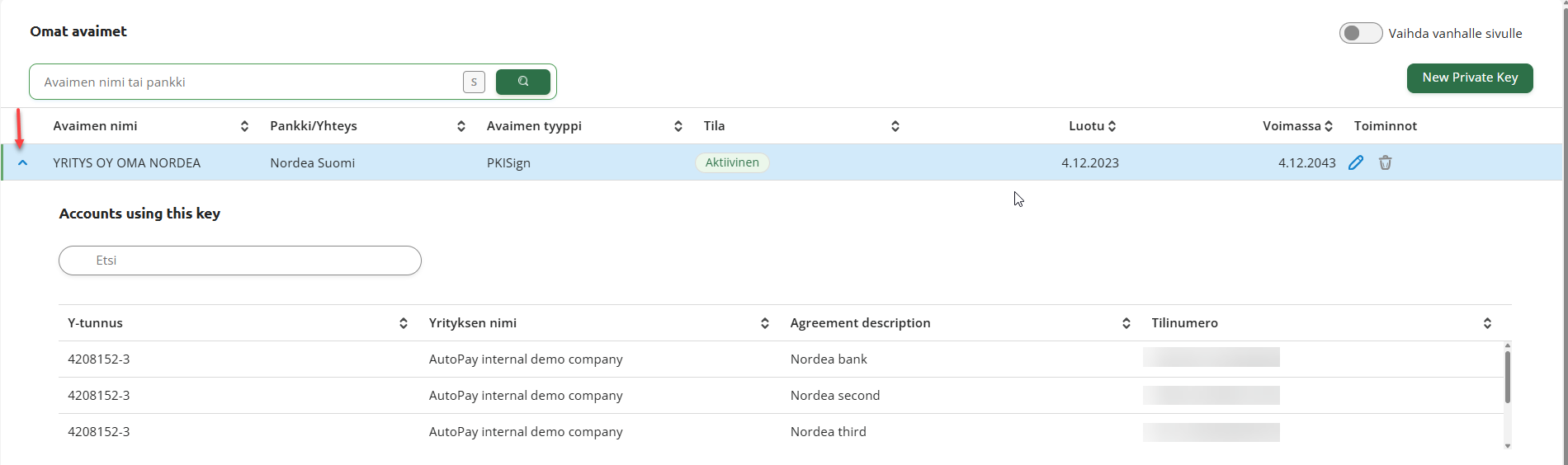 Näet avaimeen liitetyt pankkitilit painamalla avaimen rivin alussa olevaa sinistä nuolta. Avaimen alapuolelle avautuu lista pankkitileistä, jotka ovat liitetty kyseiseen avaimeen.