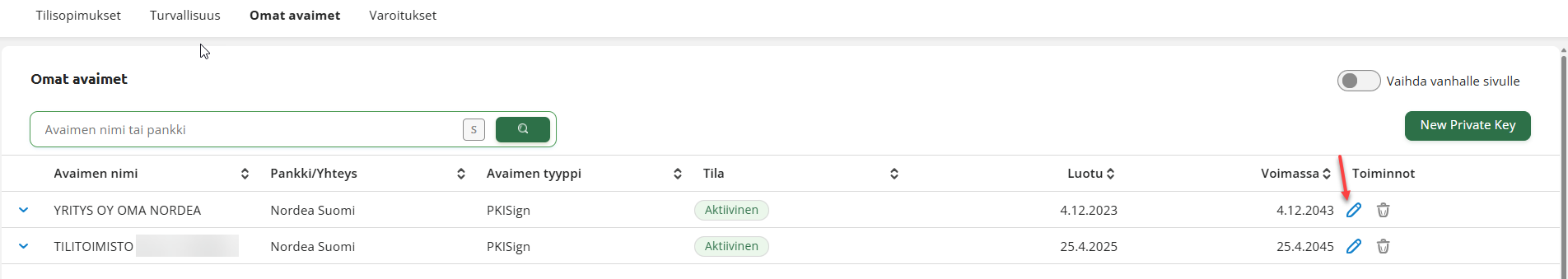 Voit muokata avaimen tietoja napsauttamalla sen rivin lopussa olevaa kynäkuvaketta. Muokkausnäkymä avautuu uuteen ikkunaan.