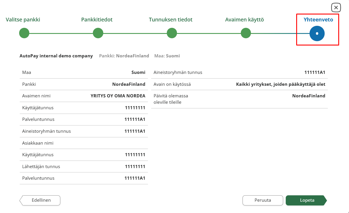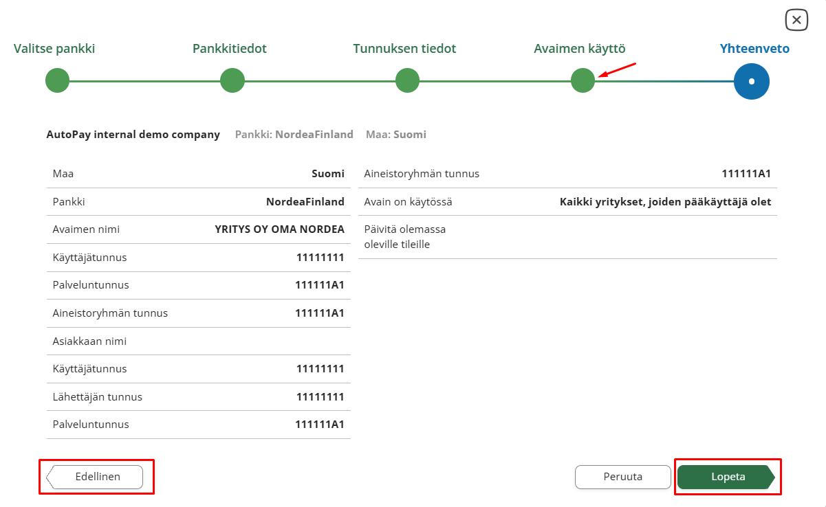 - Klikkaa oikeasta alareunasta Lopeta niin Autopay aloittaa avaimen noutamisen pankista. Noutamisen jälkeen avain ilmestyy ylläpitosivulle. Tämän jälkeen avaimen tietoja ei tulisi enää muuttaa.