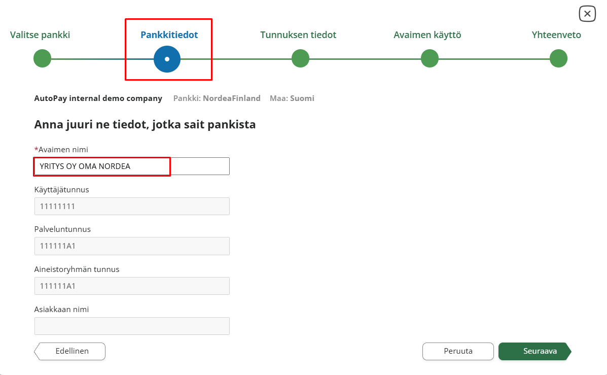 - Asiakkaan nimi: Syötä Nordean sopimukselta yrityksen nimi. (HUOM! Kirjoita Nimi juuri siinä muodossa kuin se on sopimuksella eli esimerkiksi kokonaan isoilla kirjaimilla!)
