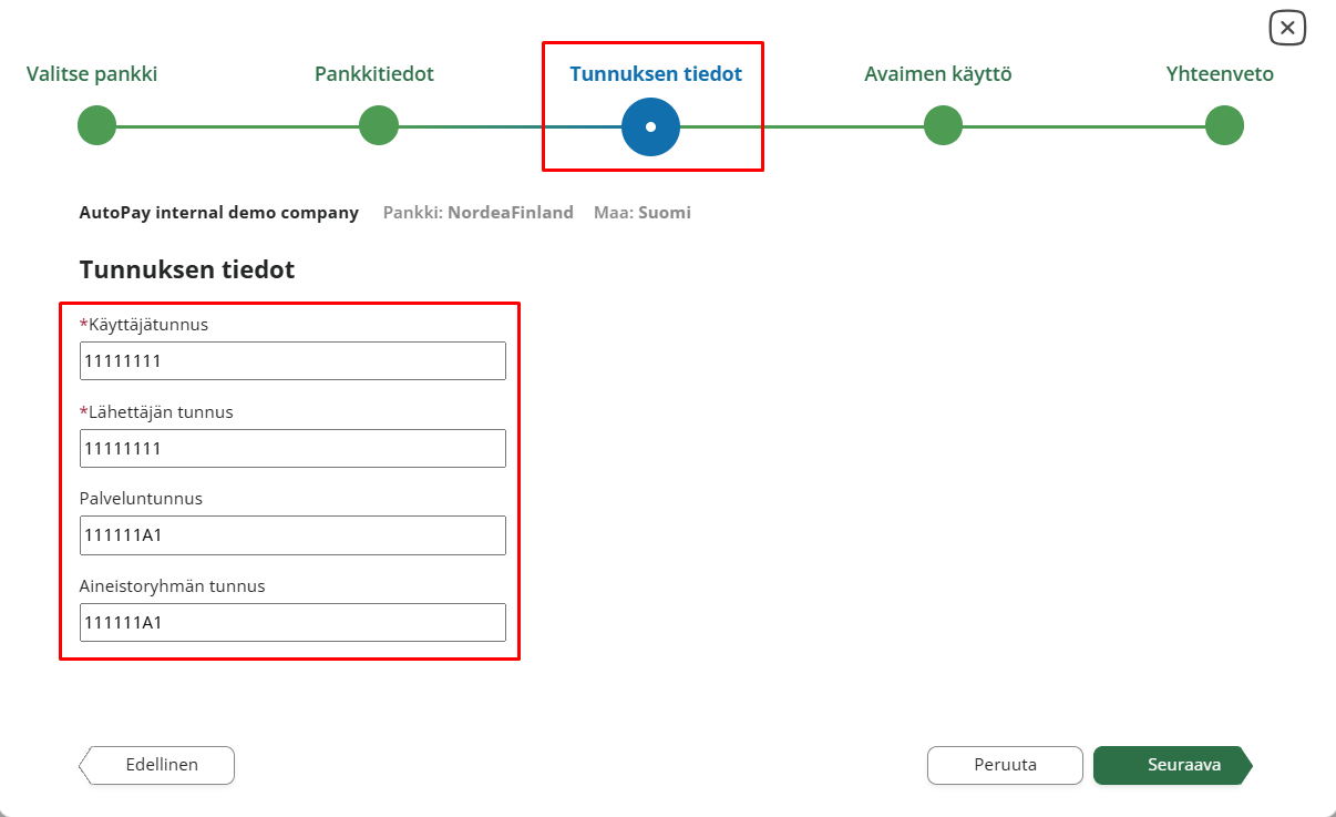 - Aineistoryhmän tunnus: Syötä Nordean sopimukselta Aineistoryhmän tunnus.