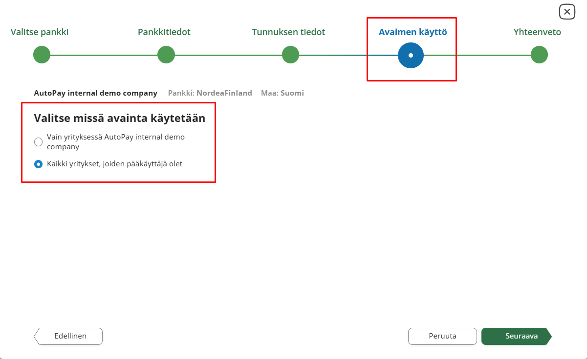 Avaimen käyttö -välilehdellä voit valita käytetäänkö avainta ainoastaan valitussa yrityksessä vai kaikissa yrityksissä, joiden pääkäyttäjä olet.