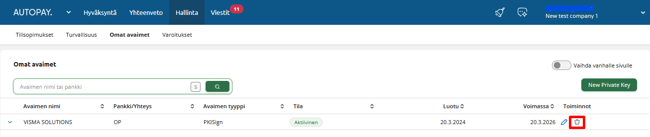 Tarpeettoman avaimen voi poistaa Autopaysta kohdassa Hallinta > Omat avaimet painamalla poistettavan avaimen rivin lopussa olevaa roskakoripainiketta. Painike on käytettävissä vain, jos avaimeeseen ei ole kytketty mitään pankkitiliä.