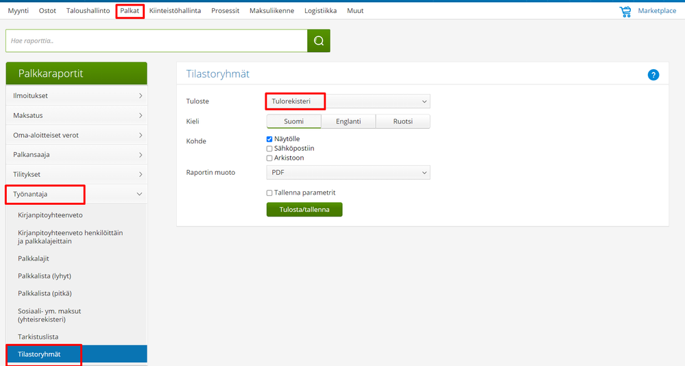- Tulosta tilastoryhmät-raportti valitsemalla tulorekisteri.