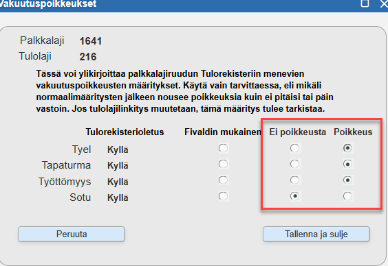 Syynä tähän on yleensä se, että palkkatietoilmoituksella on ilmoitettu virheellisesti tieto vakuutuspoikkeuksesta tai vakuutuspoikkeus tieto puuttuu palkkatietoilmoitukselta. Tarkista tällöin palkkalajin vakuutuspoikkeus-määritykset. Jos valittuna on "Fivaldin mukainen", kaikkien muiden samassa vähennys palkkalajiryhmässä olevien palkkalajien asetukset vaikuttavat siihen, ilmoitetaanko palkkatietoilmoituksella vakuutuspoikkeus vai ei. Ongelma saattaa tulla esille varsinkin silloin, kun tapaturmavakuutus- tai ryhmähenkivakuutus palkkalajin perusteiden määritykset valitaan palkkalajikohtaisesti.