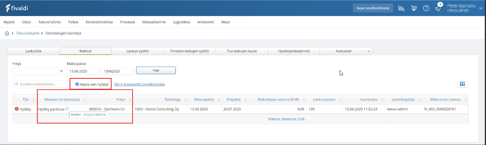 Maksut välilehdellä pystyy seuraamaan maksuja. Listalla on mahdollista rajata maksuja yrityksen ja päivämärään mukaan. Myös maksujen rajaaminen vain hylättyihin on mahdollista. Hylkäyksen syyn näkee i-painikkeesta.