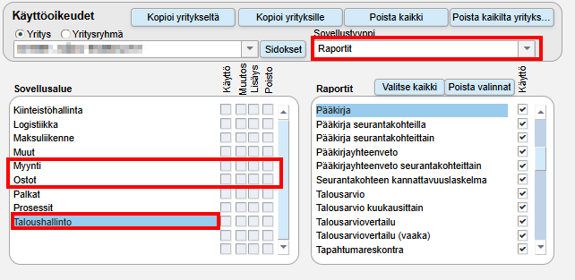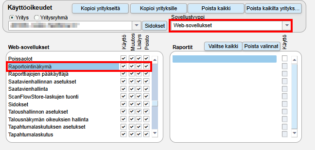 Lisäksi vaaditaan yrityskohtaisesti oikeudet tulostettaviin raportteihin: